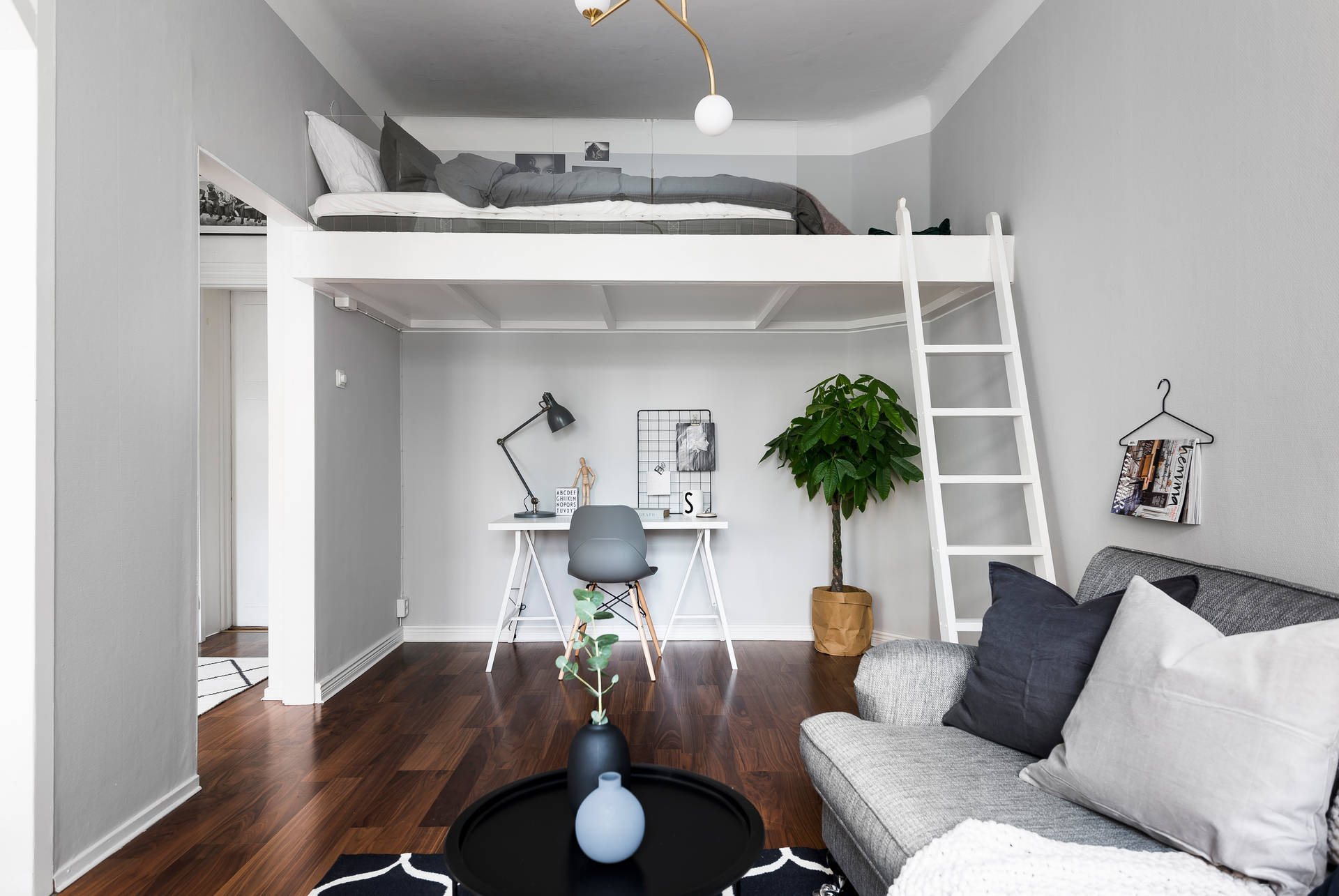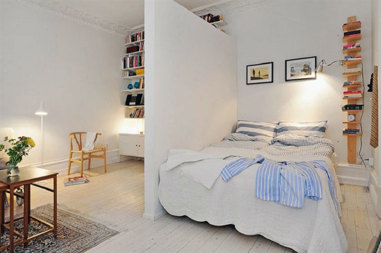 - La partición no es una pared en toda regla, pero ubica perfectamente la habitación, separando el lugar para dormir del área de trabajo.