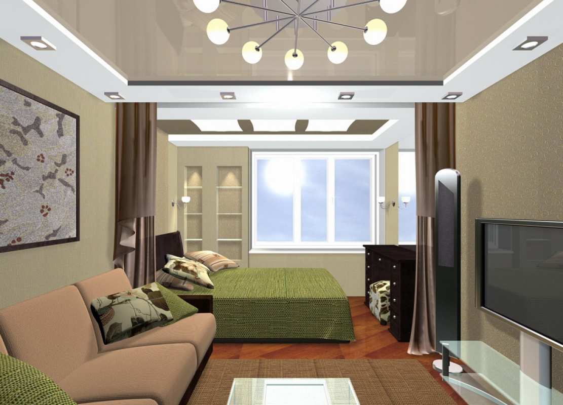 - Combinando sala de estar y dormitorio. Si solo hay un niño en su familia, puede equipar una mini guardería para él en la sala de estar separando las zonas nuevamente usando una pared de cartón yeso. El bebé "vivirá" en la parte cercana a la ventana: instale una cuna, una cómoda para las cosas de los niños allí, equipe un área de juegos. El resto de la habitación se utilizará como sala de estar: coloque un sofá, una mesa de café y un televisor. Otra opción para dicha zonificación es la instalación de un adolescente o un pariente anciano en un dormitorio separado y la disposición de una "habitación de los padres" en la sala de estar (similar a cómo equipamos una guardería). El único inconveniente será que será imposible lograr la máxima privacidad en dicha habitación durante el día.