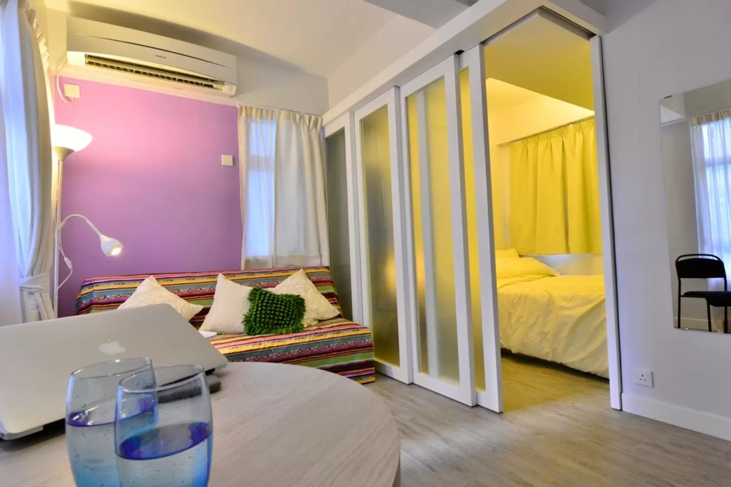- La habitación trasera se convirtió en un dormitorio y una guardería.que van a la sala de estar.Tenga en cuenta que obtuvimos 2 habitaciones completas combinando con una logia e instalando una pared entre ellas. Cada habitación también tiene su propia salida equipada con una puerta de compartimento.