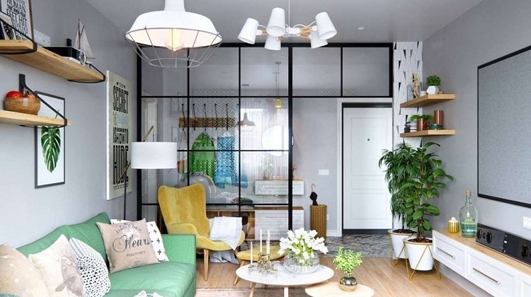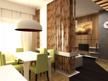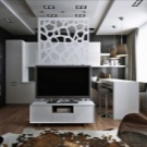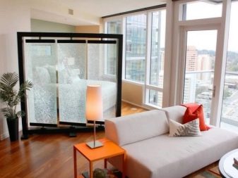 - Mampara de cristal - también un elemento interior popular, que en realidad divide la habitación en dos partes. Uno sigue siendo una mini sala de estar, el segundo se convierte en un dormitorio (o una guardería o una oficina).