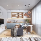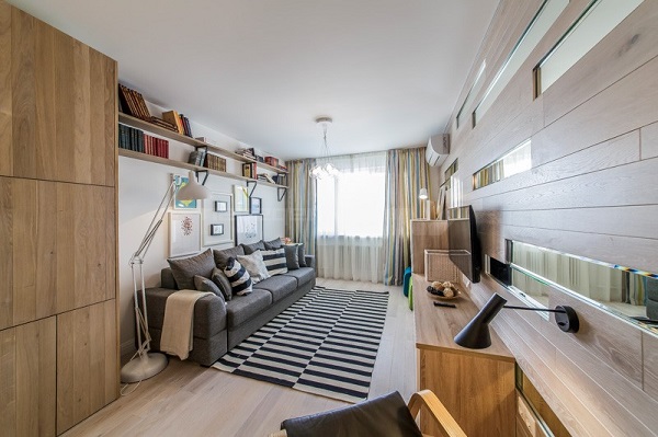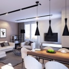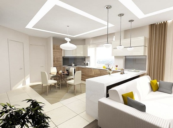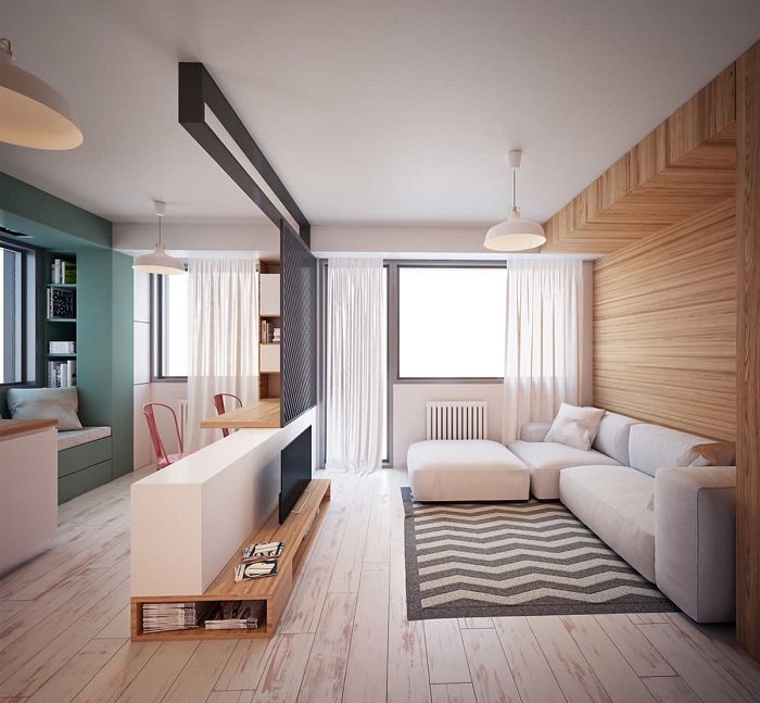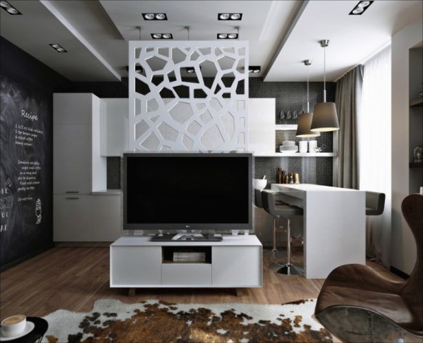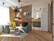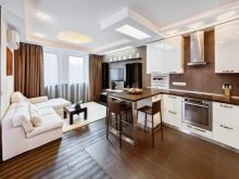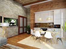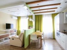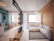 - La sala de estar en una sola habitación, parcialmente combinada con la cocina, hace que el espacio se abra. Al mismo tiempo, la zona de dormir permanece detrás de la cortina, con iluminación propia, aislada. En un diseño de este tipo, es importante que se observe el mismo acabado en todas las partes del apartamento.