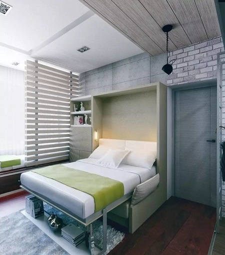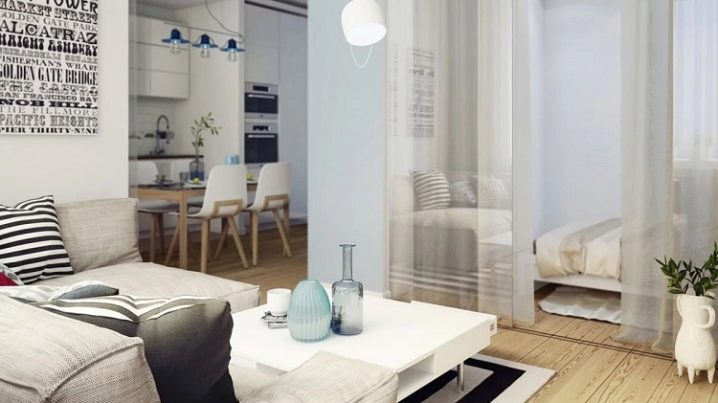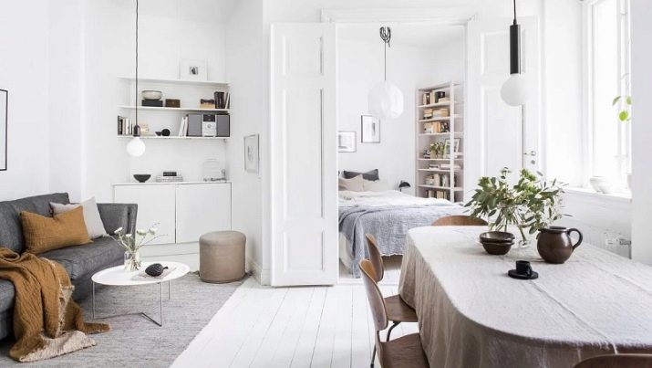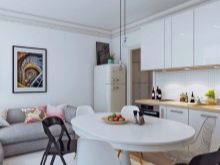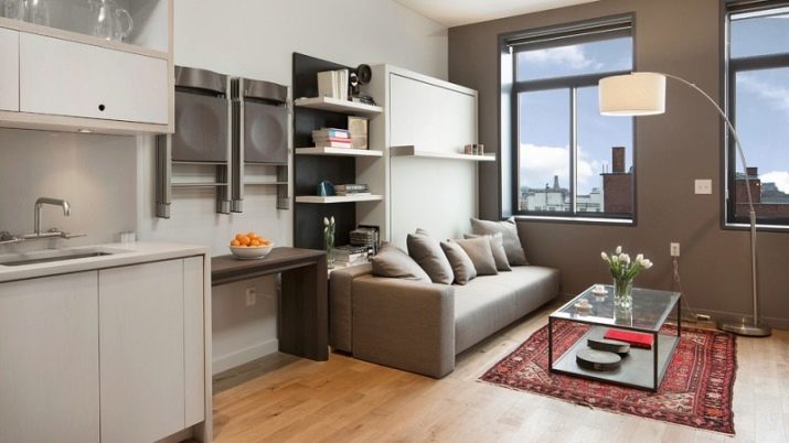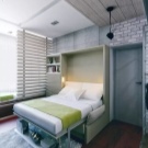 Por lo general, en odnushki intentan elegir muebles que se usarán activamente, capaces de integrarse y transformarse. Se puede colocar en nichos de pared y nichos. Puede ser una cama con mecanismo de elevación que solo se puede desplegar por la noche. Si no es una cama así, un sofá que sirve como un sofá espacioso ordinario durante el día y se despliega como una cama por la noche. La habitación puede tener una mesa transformadora, una mesa de café que se puede expandir a un comedor. Es muy conveniente los días de recepción de invitados, y el resto del tiempo no ocupa espacio extra.