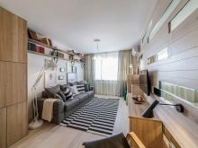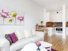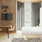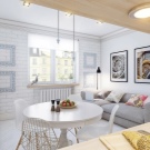 - Y esta es una variante de un apartamento de una habitación convertido en estudio. El apartamento está decorado en estilo ecológico, lo que agrega dinamismo incluso al espacio más deshabitado. Los colores se combinan muy bien, la decoración se elige de manera óptima. Todas las partes del apartamento se ven orgánicas y el espacio, incluso visualmente, parece más grande de lo que es.