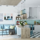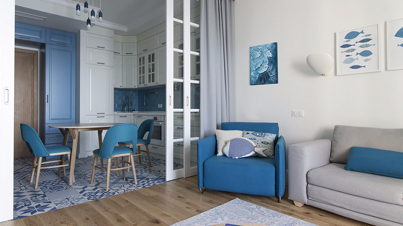 - Otro espacio fusionado que transforma por completo el apartamento estándar de una habitación. El blanco y el azul oscuro son una combinación muy agradable, refrescante y calmante.