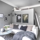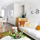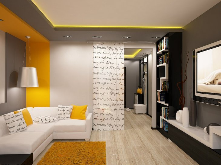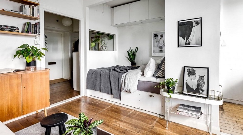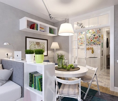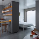 - Un pequeño apartamento está claramente dividido en zonas con una estantería inusual y una pequeña cortina. Digan lo que digan, habitaciones tan pequeñas necesitan un color blanco, que crea los efectos visuales necesarios y elimina la sensación de hacinamiento.