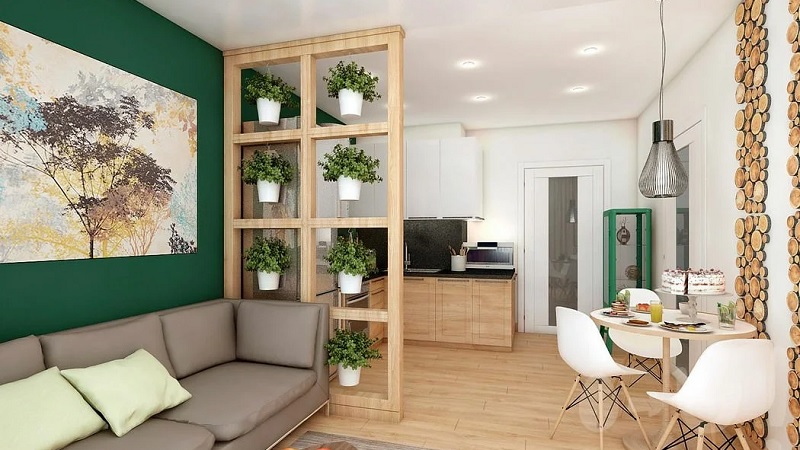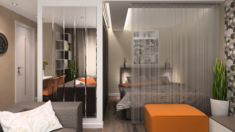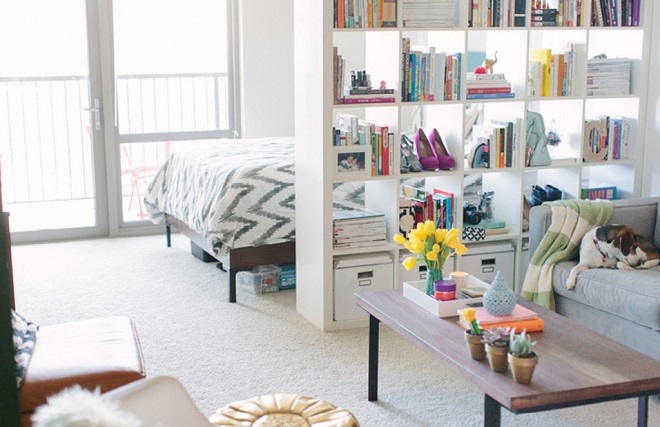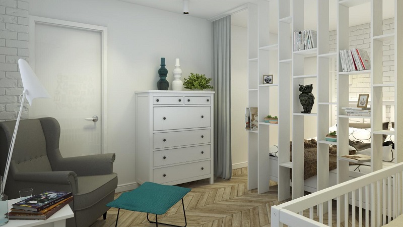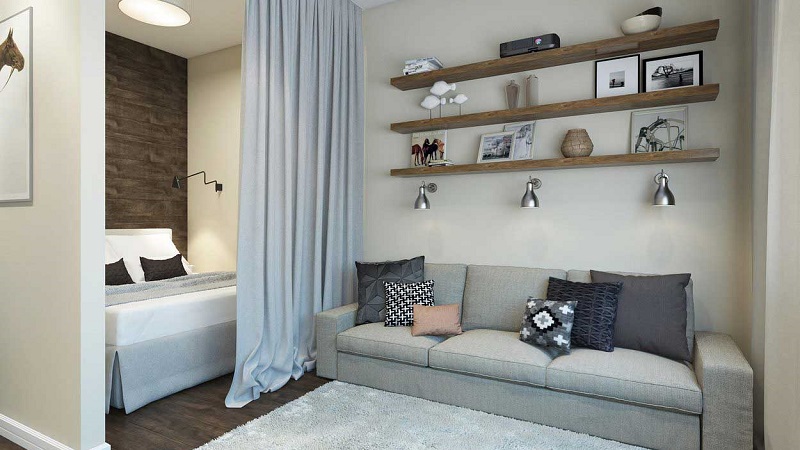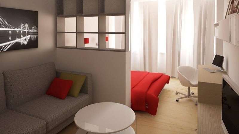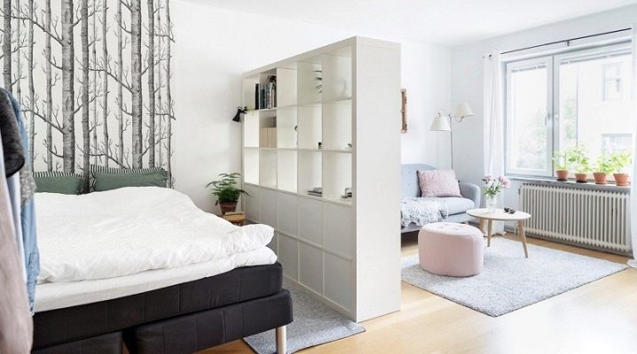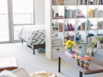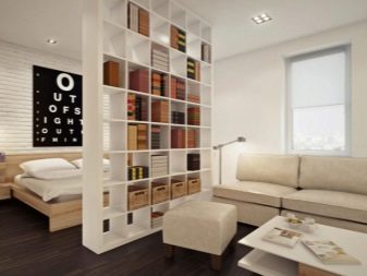 - Estante - una opción popular para dividir las áreas privada y frontal, que no se pueden aislar completamente en un apartamento de 1 habitación. Es beneficioso porque se considera un lugar de almacenamiento.