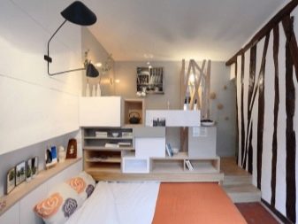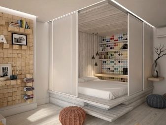 - Podio - y nada más. Esto puede ser suficiente para la distribución visual de zonas. Además, puede haber una cama o cajas de almacenamiento dentro del podio.
