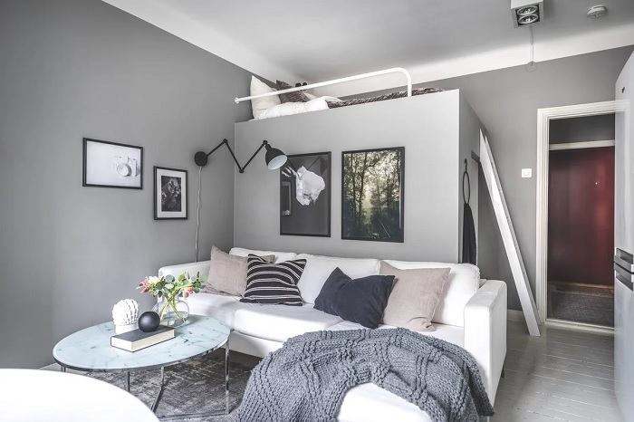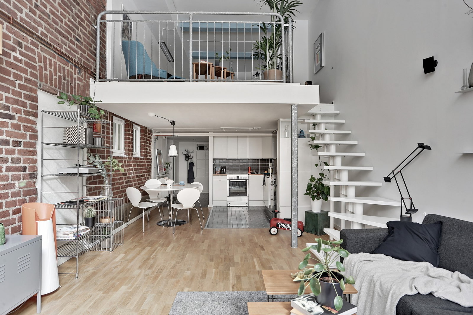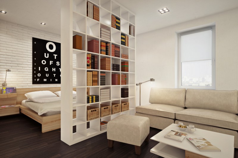 - Una partición con una parte de las estanterías separa la sala de estar del dormitorio, que se encuentran en una habitación. Parte del dormitorio también tiene capacidad para una zona de trabajo.