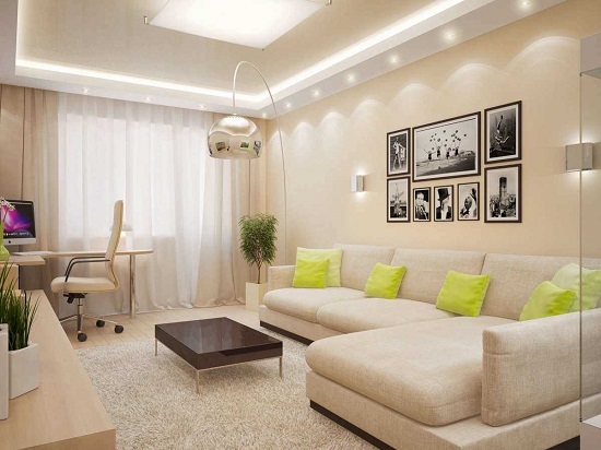 Se considera que una opción casi segura en una habitación de 18 metros son las paredes claras con muebles ligeros. Pero para que el espacio no parezca informe, hay acentos contrastantes: sillas, marcos, textiles y más. Es más fácil colocar los muebles en 18 metros cuadrados alrededor del perímetro, con la excepción de la mesa de café, que se acercará al centro de la habitación.