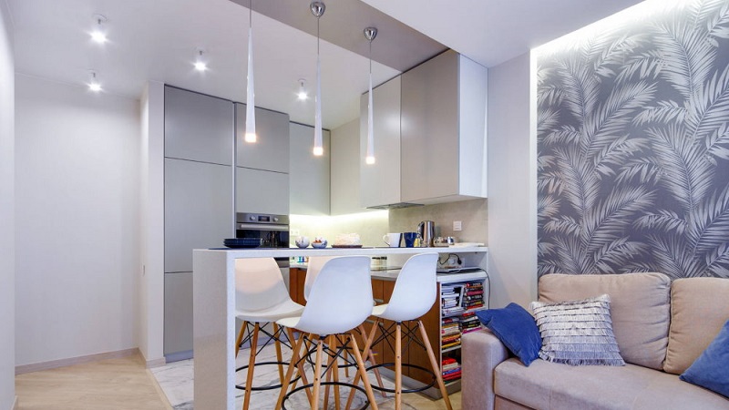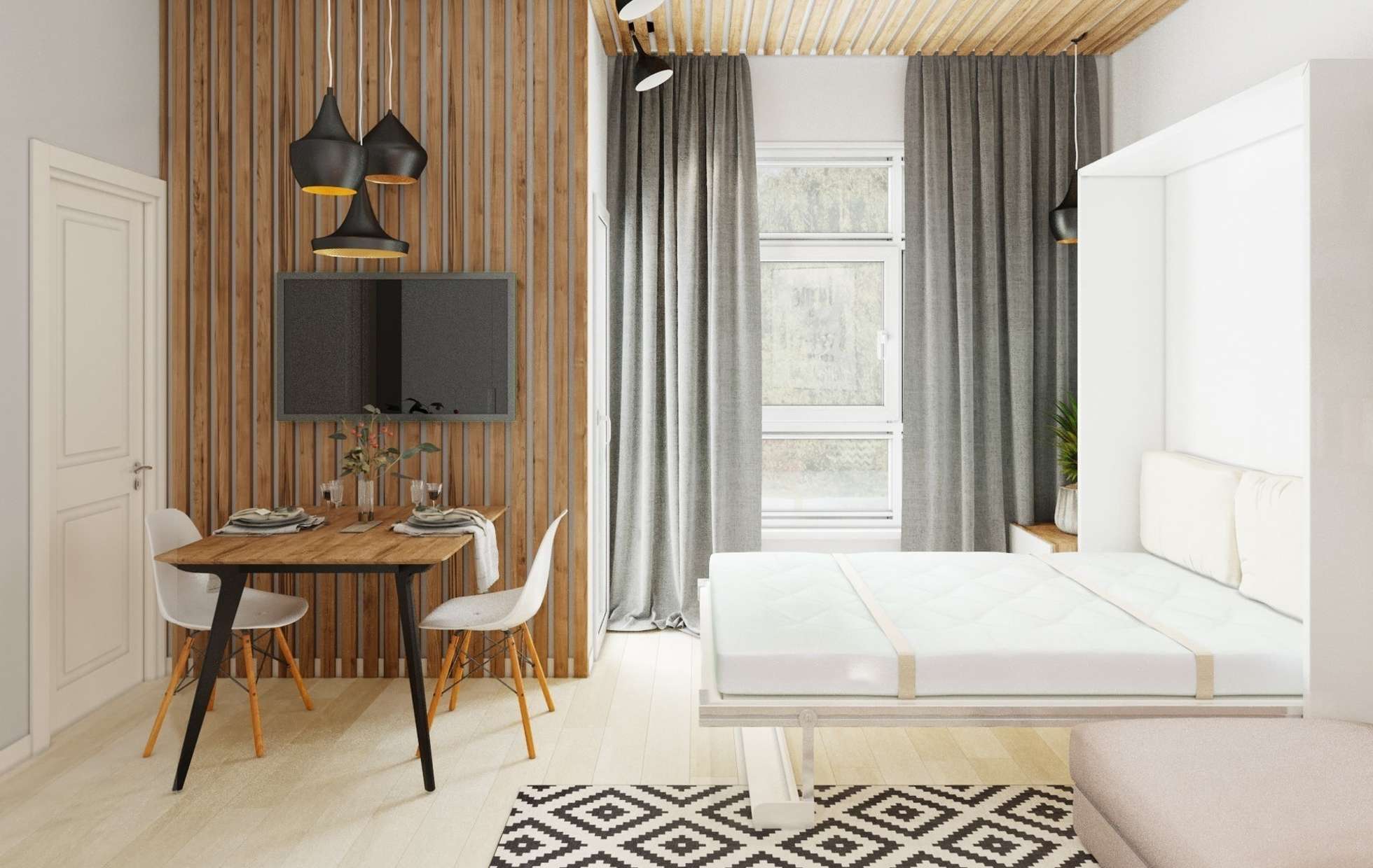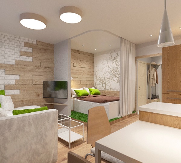Puede decorar las paredes en un apartamento de una habitación no solo con papel tapiz.