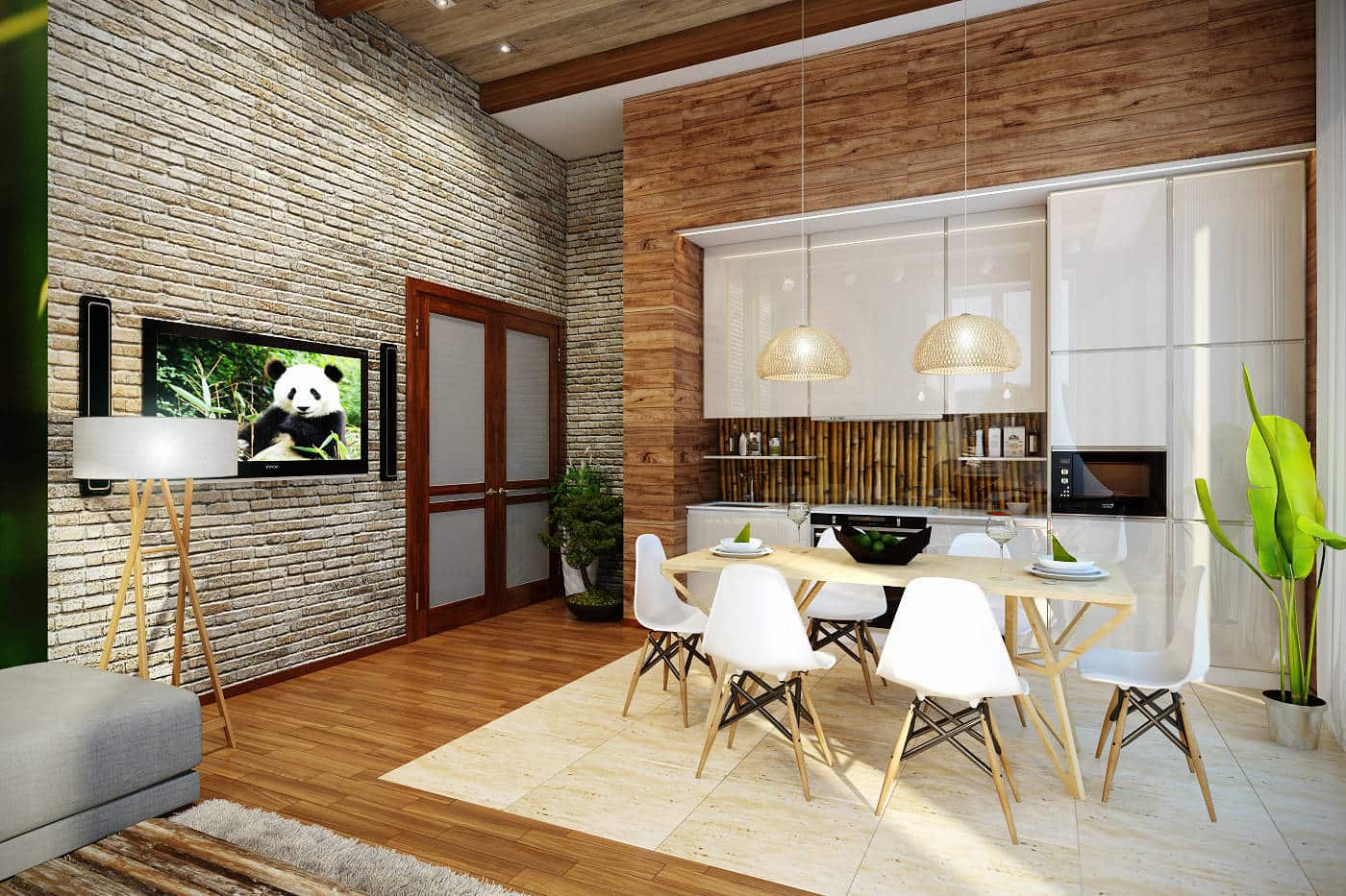 - Ecostyle. Solo se utilizan materiales naturales en la decoración, el diseño asume un espacio abierto brillante.En un interior de este tipo, no puede haber pieles y cuero naturales, techos tensados e incluso en lugar de un laminado, es preferible un piso de madera natural.