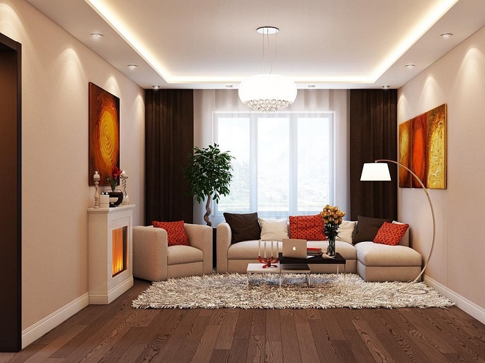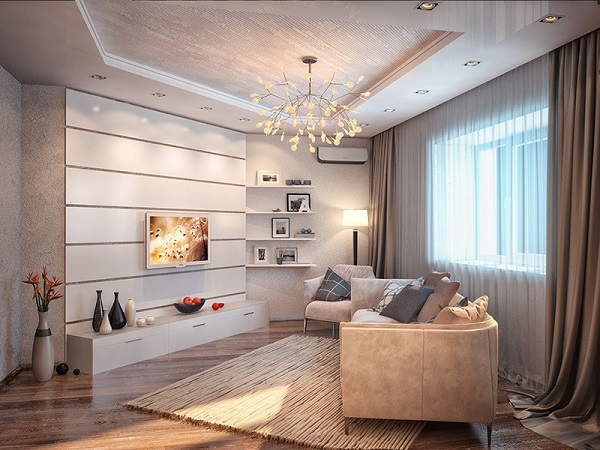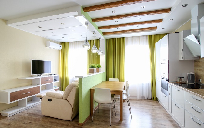 Pueden aparecer vigas decorativas poco voluminosas en el techo, lo que agrega significativamente comodidad a la habitación. Pero dividir una habitación en zonas utilizando la zonificación del techo también es cosa del pasado, aunque si realmente te gusta, ¿por qué no hacerlo? Es cierto que a 18 metros no querrás "comer" ni un centímetro extra, y las estructuras del techo enmarcadas te obligan a hacerlo.
