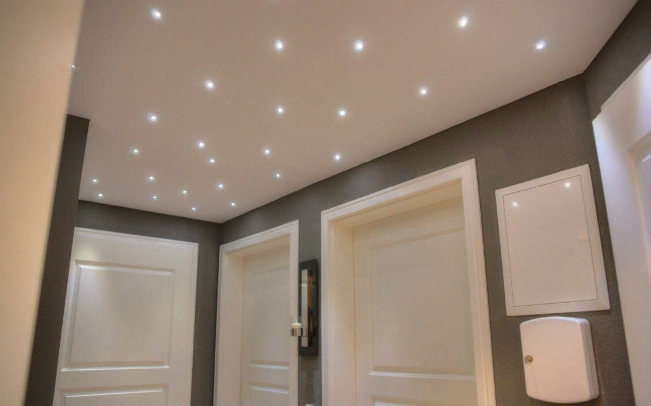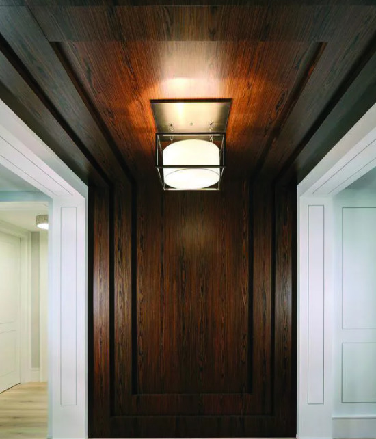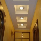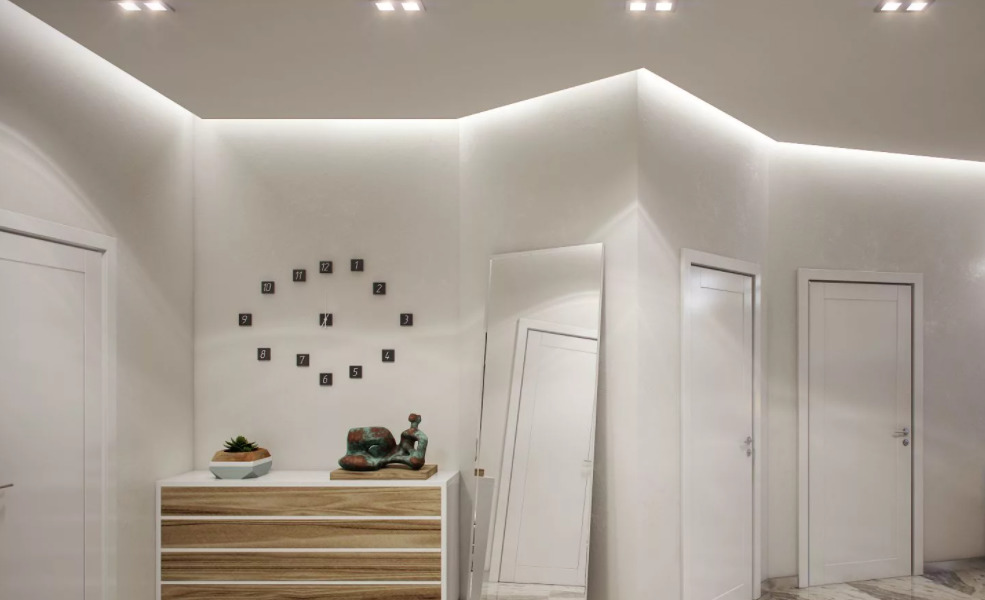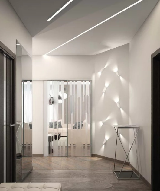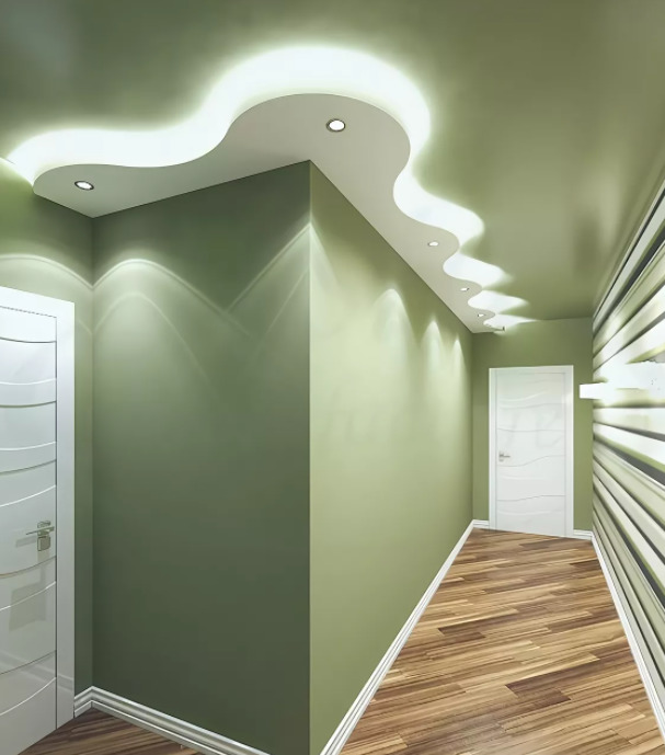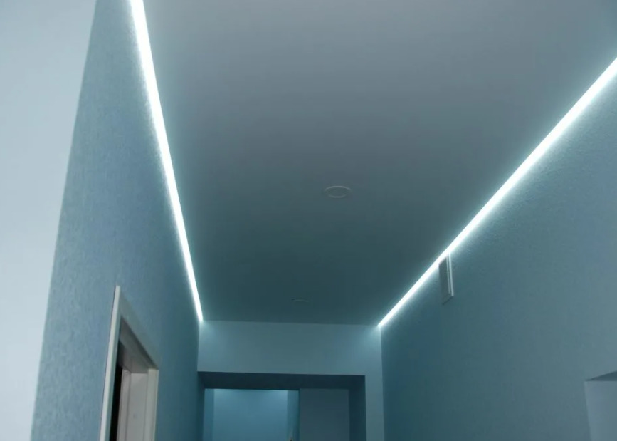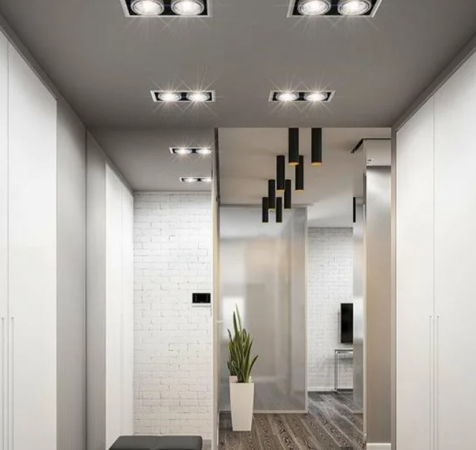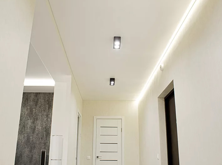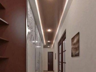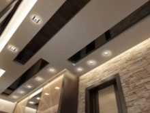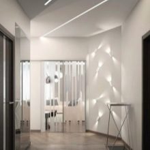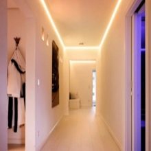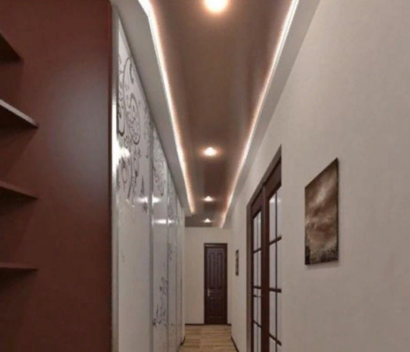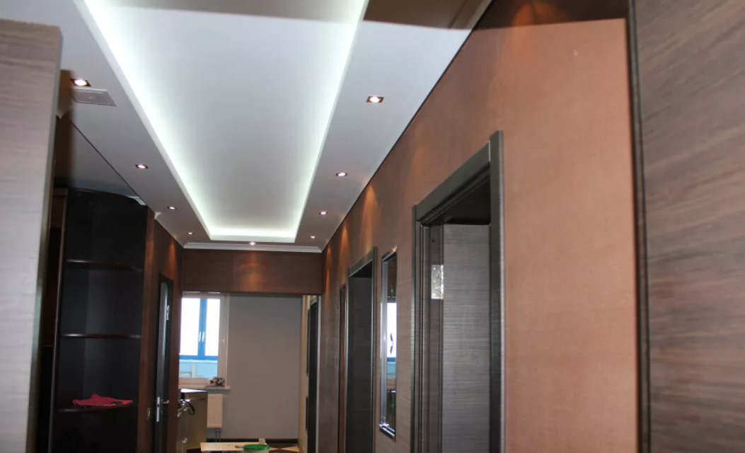 - Por un largo pasillo (diseño más popular).Se requiere lo siguiente de la decoración: expandir el espacio estrecho y acortarlo visualmente. Las opciones se verán mejor en las que el techo del pasillo sea un tono más claro que las paredes. Las superficies blancas se ven bien. Los materiales livianos y brillantes crearán un volumen extra. Los elementos transversales del techo expandirán visualmente el pasillo. Las estructuras en varios niveles, complementadas con retroiluminación LED, ayudarán a suavizar un poco las líneas.