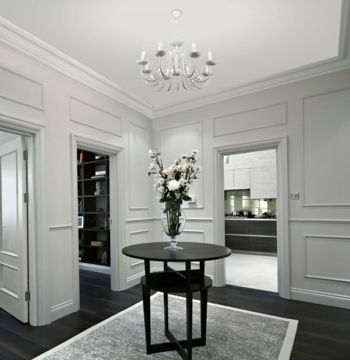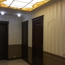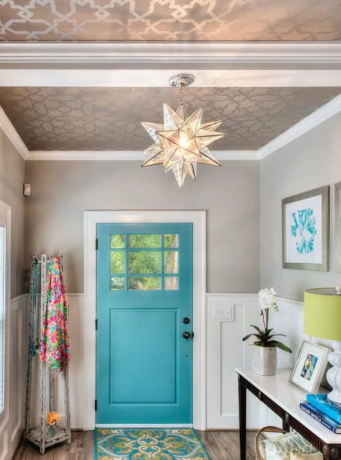 La altura del techo es un indicador importante que debe tenerse en cuenta al elegir un material de acabado. Por ejemplo, una lámpara de araña grande o diseños escalonados no funcionarán para techos bajos. El dibujo o la impresión también deben ser coherentes con el diseño de toda la habitación. Para pasillos pequeños, las impresiones demasiado grandes no serán apropiadas.