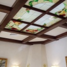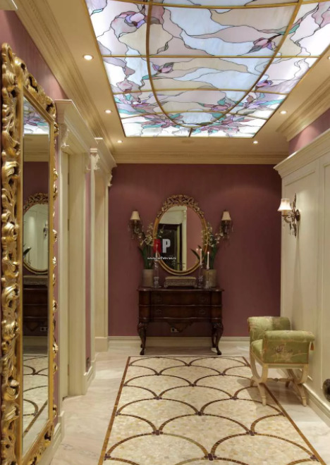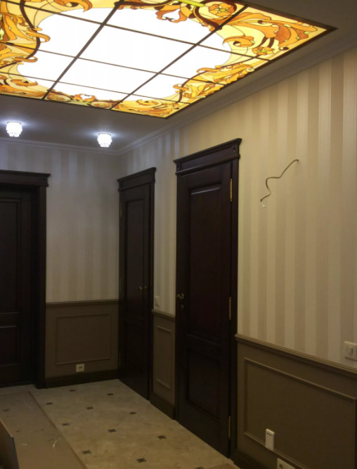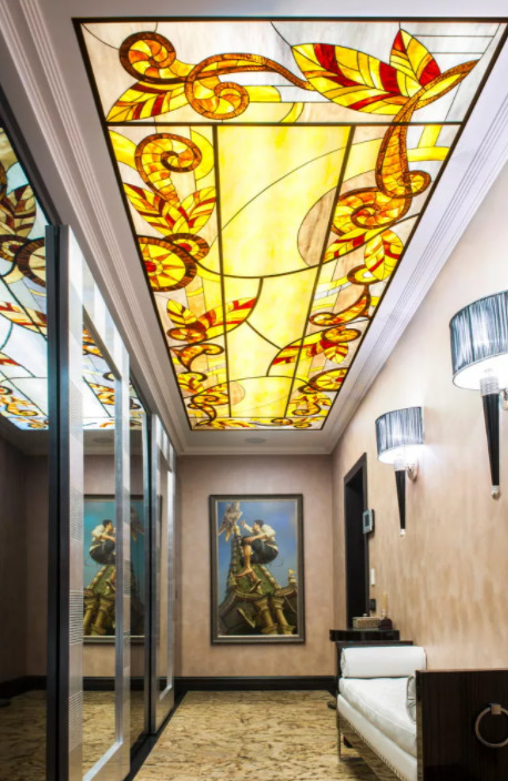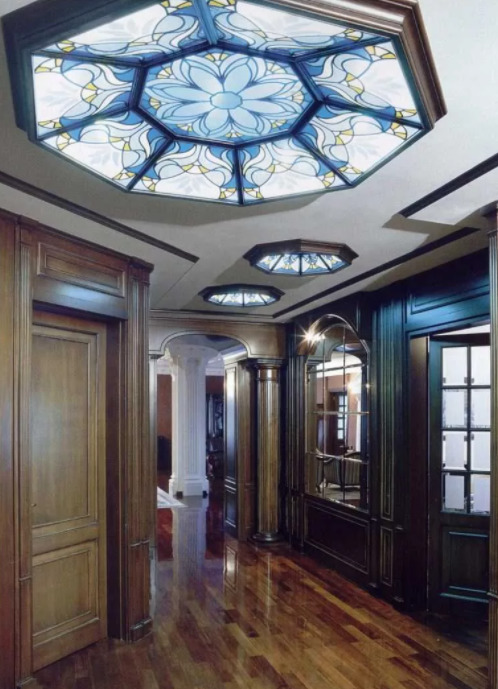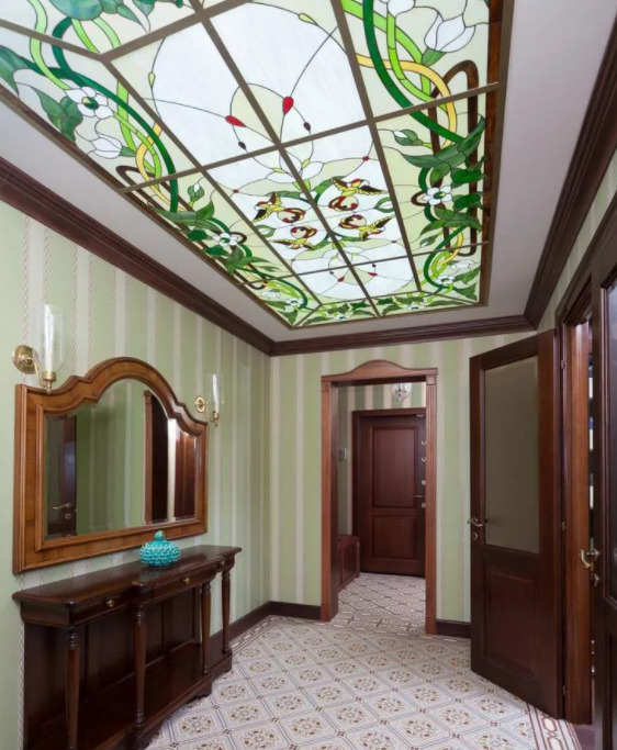 Las vidrieras son materiales de acabado de lujo. Los hermosos mosaicos de vidrio pueden formar patrones completamente inesperados y lucir muy bien en cualquier habitación. El mosaico de vidrieras parece caro y encaja bien con el estilo clásico o barroco. Además, los techos de mosaico complementan de manera interesante el estilo Art Nouveau, gótico o de alta tecnología. La iluminación incorporada le permitirá revelar toda la belleza y sofisticación del mosaico, por lo que a veces esta opción es mejor que una lámpara de araña normal.