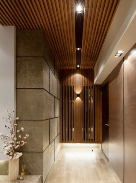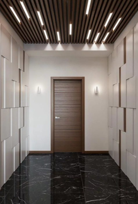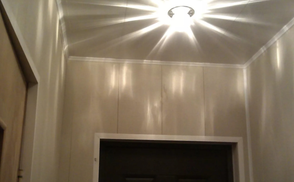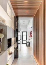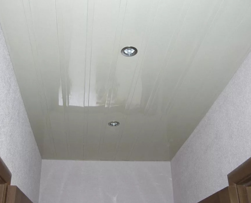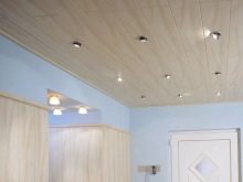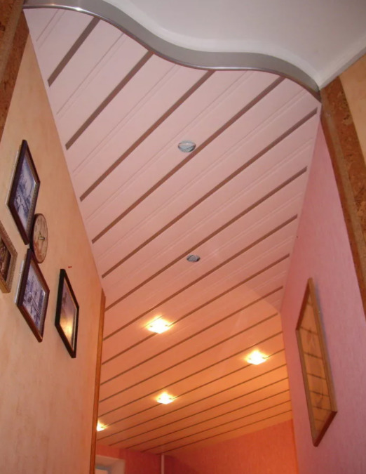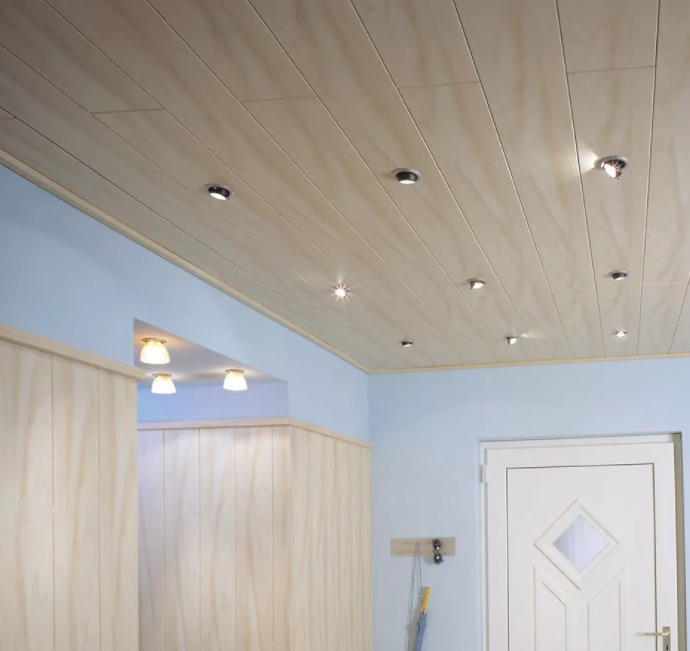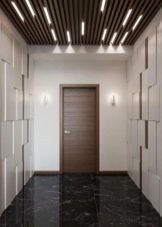 Los paneles de plástico estuvieron en la cima de la moda hace diez años. Hoy en día, las losas de este material se pueden ver a menudo en oficinas y también se utilizan en renovaciones de baños. Si elige los colores correctos, piense en la posición de las tablas, luego puede organizar un interior inusual del techo del pasillo. Por ejemplo, el material en colores beige o marrón repetirá los colores naturales de la madera y agregará un ambiente acogedor a cualquier habitación.