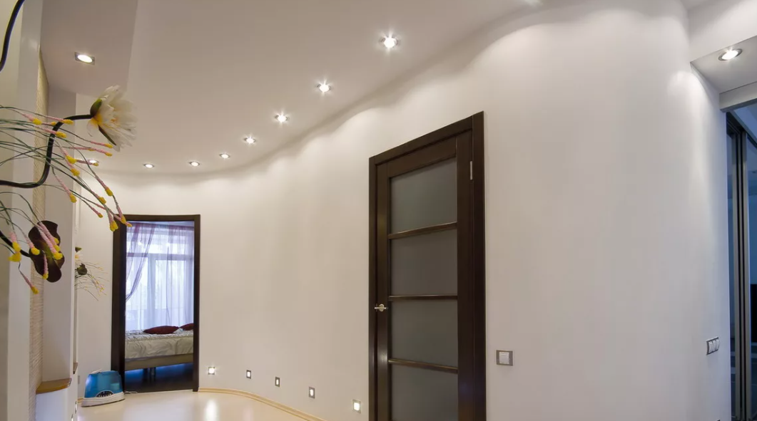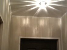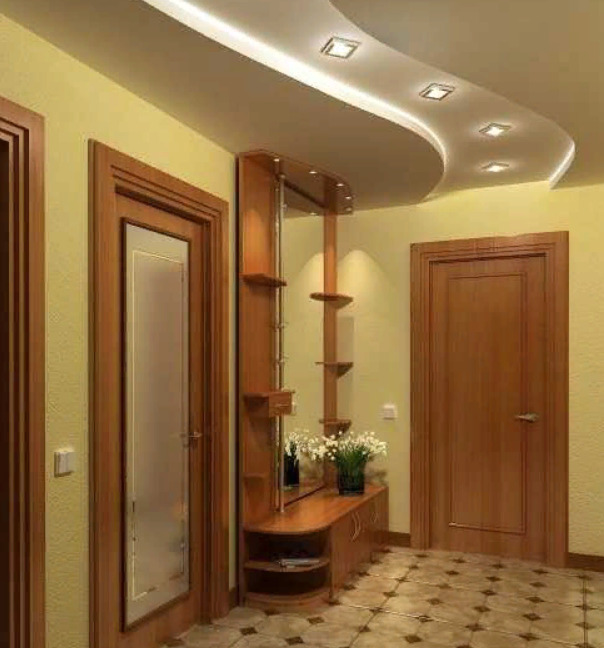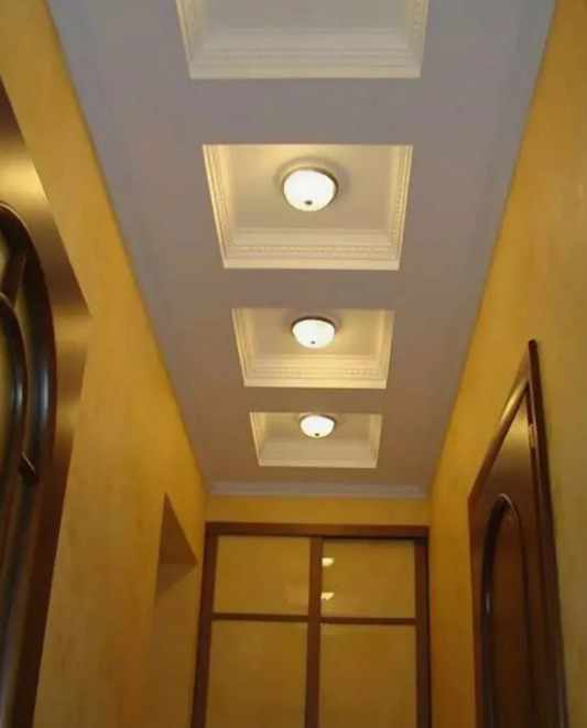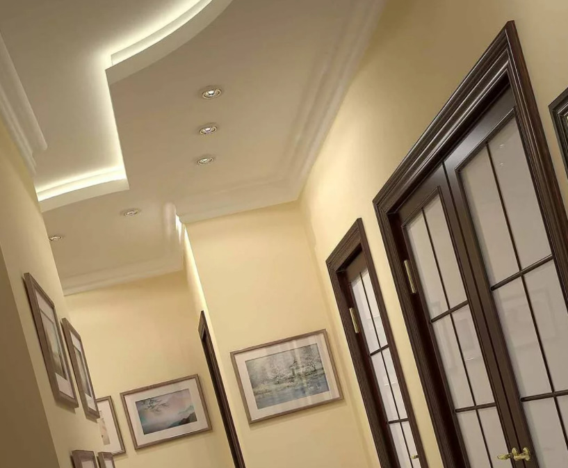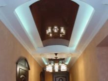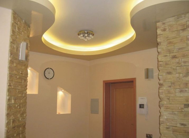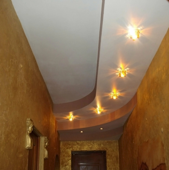 Este material funciona mejor en techos de pasillos. A partir de paneles de yeso, puede crear superficies de varios niveles de cualquier diseño, montar cualquier iluminación y vencer maravillosamente el interior de toda la habitación. A partir de este material, se erigen pilastras, columnas y arcos, que le permiten dividir visualmente el espacio en secciones.