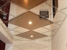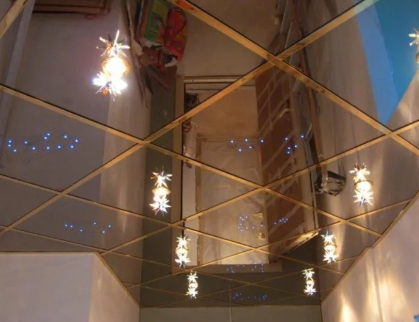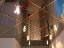 Los techos con espejos se ven muy interesantes e inusuales. Esta solución no estándar hará que el espacio sea visualmente más amplio. Para la instalación, primero se crea un marco, en el que luego se unen capas de espejo. La decoración le permite "duplicar" figurativamente el espacio. Los techos con espejos crean una experiencia de iluminación completamente única.