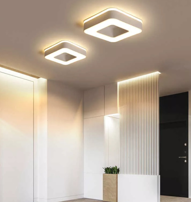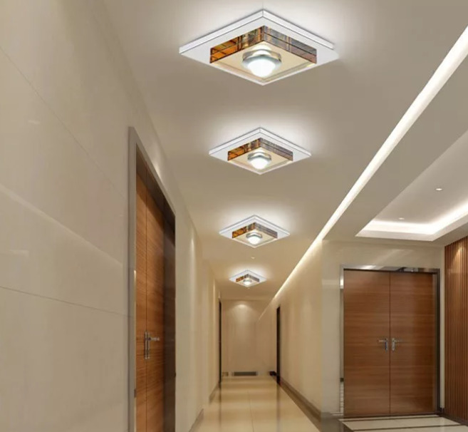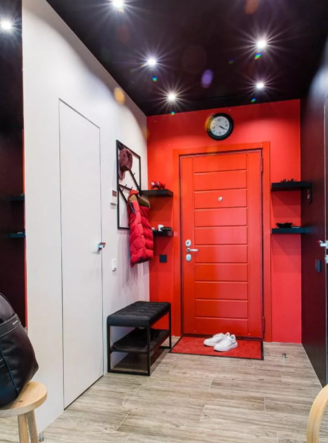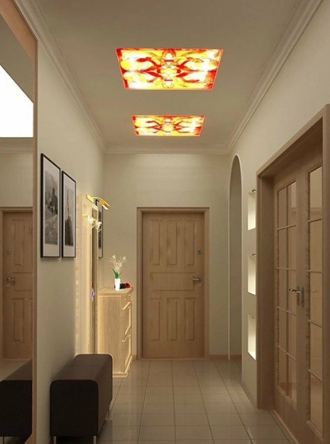 - El pasillo tiene forma de cuadrado. La disposición cuadrada se considera ideal: cualquier idea de diseño se puede realizar en ella. Puede dar preferencia a formas simples y colores tranquilos, o puede implementar soluciones geométricas complejas completamente inesperadas.
