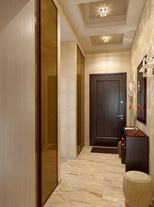 - Beige, arena, marrón. Estos son colores naturales que visualmente ensanchan el pasillo, crean comodidad en él.