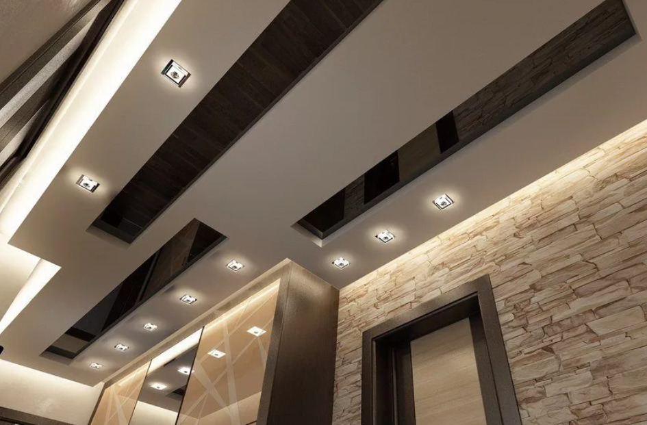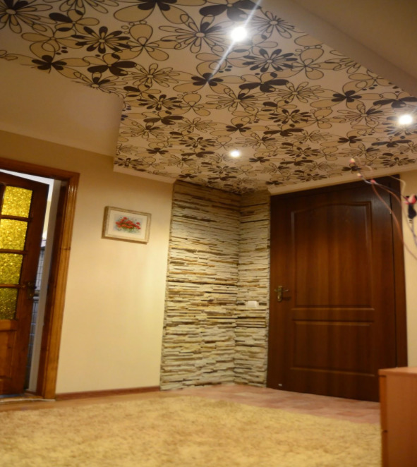 - El techo de dos niveles combina dos texturas a la vez: una base mate y una figura brillante inusual en el centro. Desde el lateral se puede ver la ubicación original de la iluminación puntual.