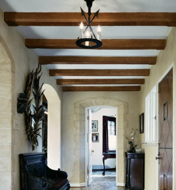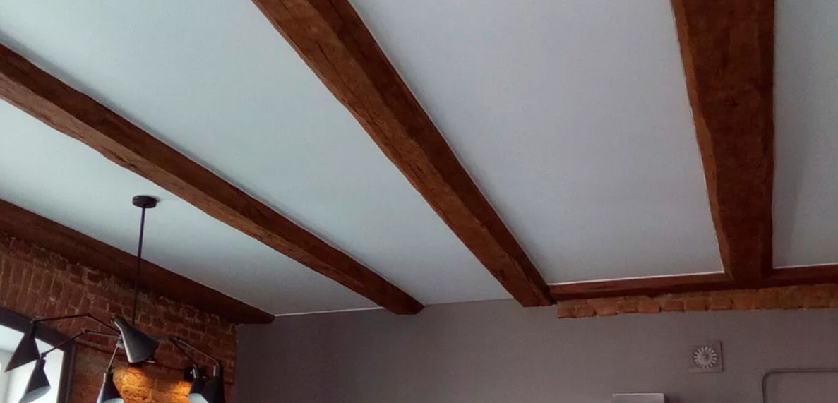 - Estructuras de vigas. Una solución bastante inusual e interesante que se usa a menudo en el interior de apartamentos modernos. Las vigas son ideales para cualquier estilo. Los techos con vigas lucen tanto en una Provenza romántica como en un estilo loft simple. Las vigas se pueden pintar del mismo color que el techo, imitar un patrón de madera o actuar como soportes de cojinetes metálicos.