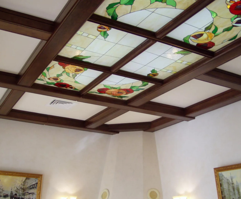 Los techos de mosaico de vidrieras se encuentran entre las opciones de decoración más caras. Dichas estructuras pueden tener varios niveles e iluminación incorporada. Esta es una gran opción que enfatizará la individualidad del espacio.