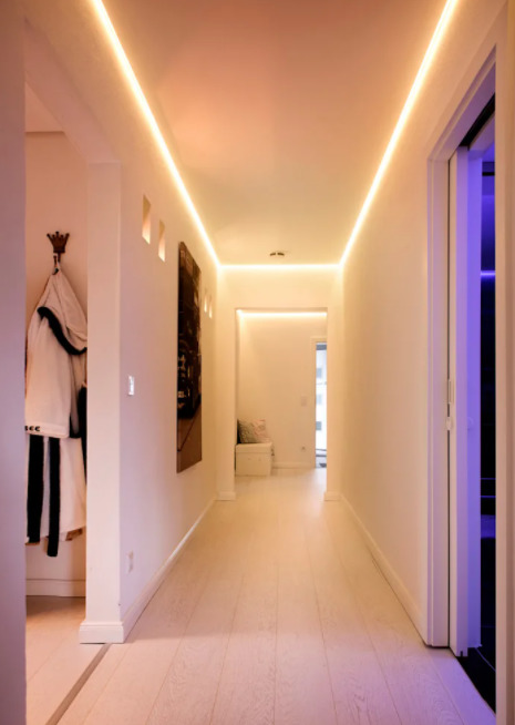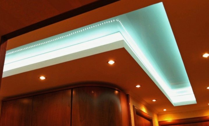 - Luces led. La luminaria de tira se instala a menudo en paredes y techos. En la mayoría de los casos se utiliza como iluminación adicional. Si la cinta se instala a lo largo del perímetro del techo, la estructura adquiere el efecto de flotar sobre el espacio.