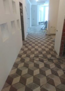Al colocar cada segmento (muestra), la loseta se inspecciona en busca de astillas y grietas. Los elementos rechazados se pueden apilar, por ejemplo, debajo de un futuro guardarropa, donde no son visibles para los forasteros. Si esto no es posible, utilícelos como materiales de construcción para otros fines: las baldosas dañadas arruinarán la apariencia del piso y del pasillo en su conjunto. Use solo elementos completos y perfectamente uniformes, sin ningún matrimonio.