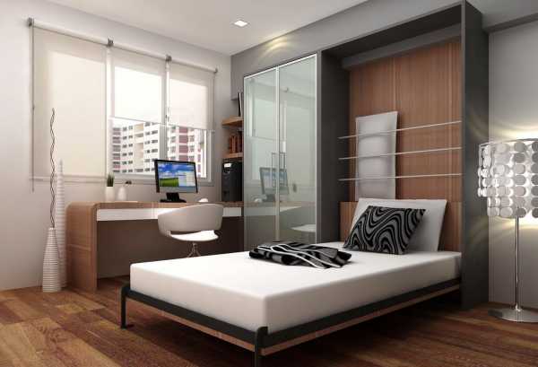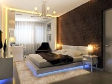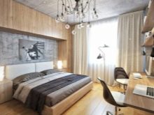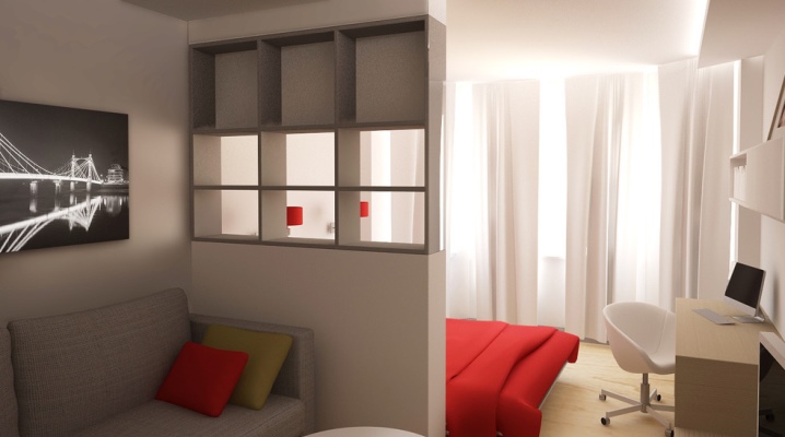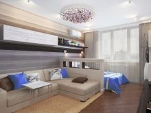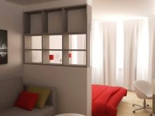 - Dormitorio sala de estar. En el caso de que el dormitorio se utilice simultáneamente para dormir y recibir invitados, el espacio de una habitación pequeña debe dividirse en dos zonas. Es mejor colocar una hermosa partición o un estante cerrado en una habitación así. Ayudará a separar un espacio de otro y el uso de diferentes colores y materiales para el acabado del piso y las paredes.
