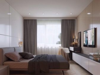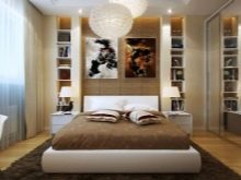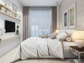 La parte principal de la habitación está ocupada por una gran cama. Por lo tanto, para almacenar cosas, debes usar todos los lugares disponibles. Un estante estrecho y elegante se ve hermoso en la pared opuesta. Hay un lugar para fotografías y decoración variada.