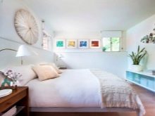 Es mejor elegir muebles livianos para tal habitación. Una gran opción son los armarios y mesitas de noche envejecidos artificialmente. Los muebles de ratán natural también se ven hermosos en ese interior. Para decorar la habitación, puedes usar tus fotos favoritas o algunas manualidades.