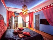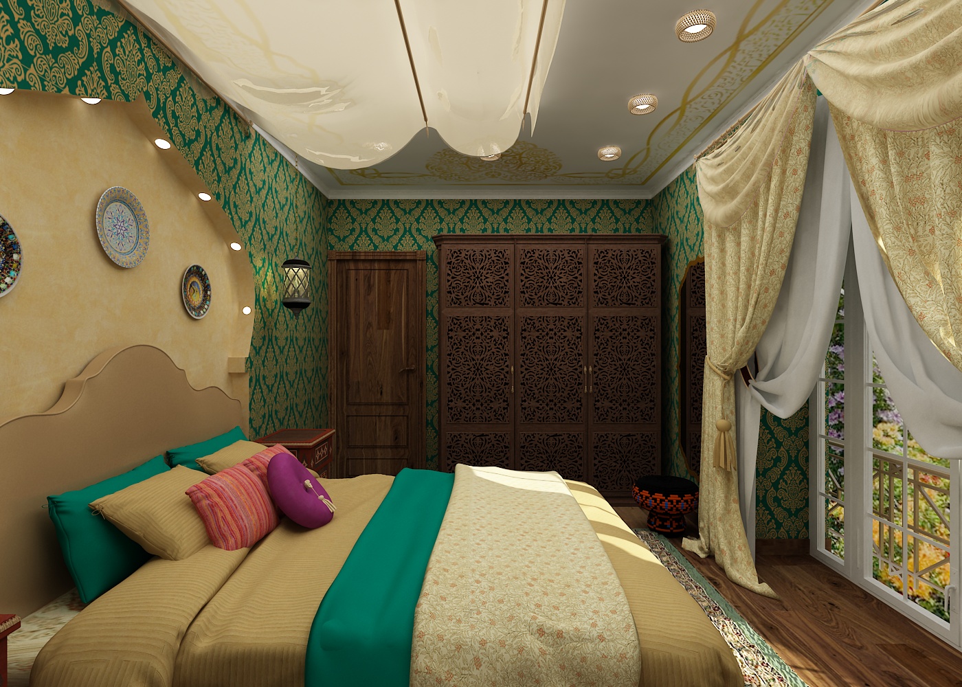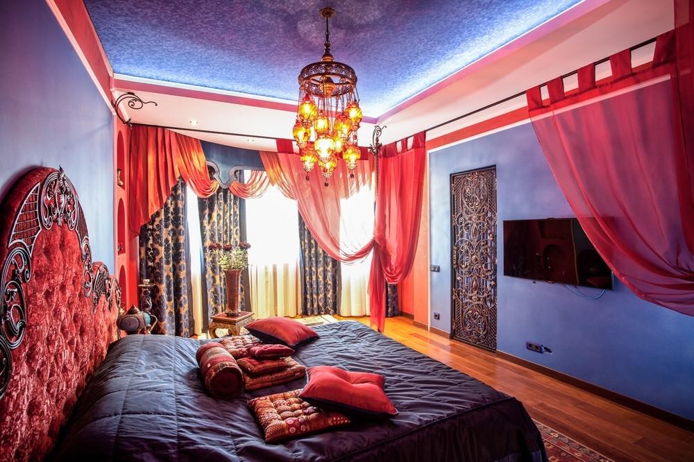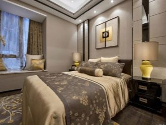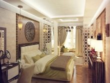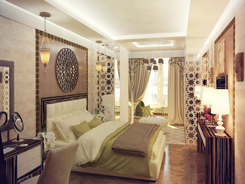 Un pequeño dormitorio de estilo oriental es un gran lugar para los amantes del lujo. Para que la habitación se vea acogedora, pero no demasiado pequeña, no debe usar colores demasiado oscuros para decorar paredes y pisos. Lo mejor es elegir cortinas que sean ligeras, fabricadas con materiales como el brocado translúcido o la organza, decoradas con hilos plateados o dorados. Para decorar la habitación, puede usar plantas vivas en macetas, pintadas con patrones originales, así como hermosas almohadas decorativas.