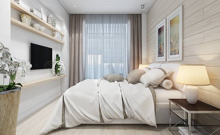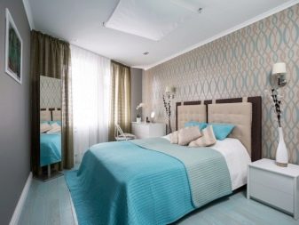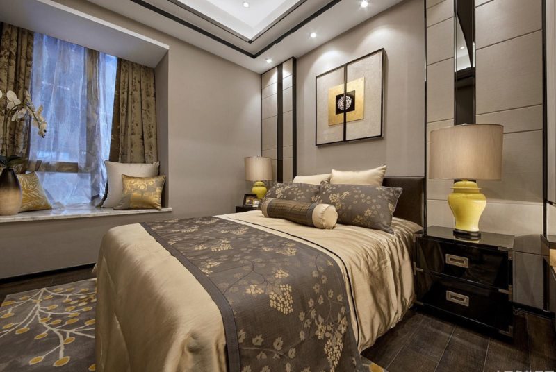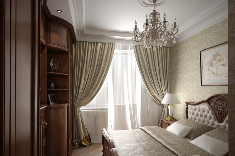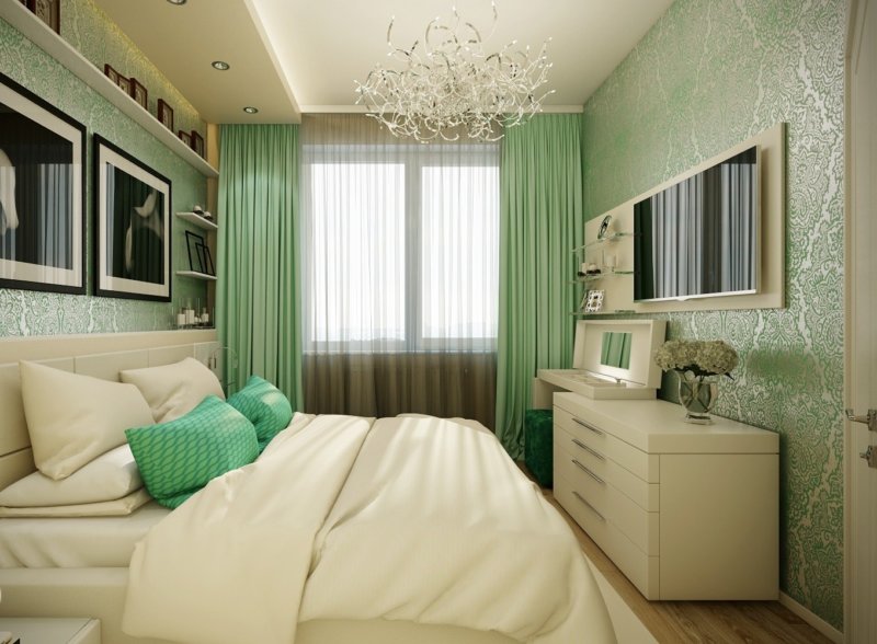 Para que el dormitorio sea más cómodo, es importante no olvidarse de los textiles y artículos de decoración de alta calidad al decorarlo. Las cortinas y otros textiles deben elegirse de manera que se mezclen bien con los materiales utilizados para decorar el piso y las paredes. Los textiles con un estampado simple y discreto quedan bien en una habitación pequeña.