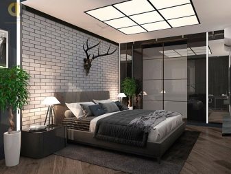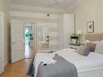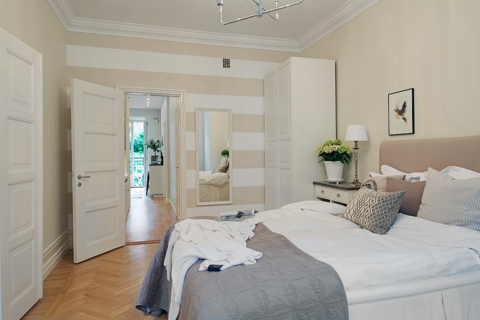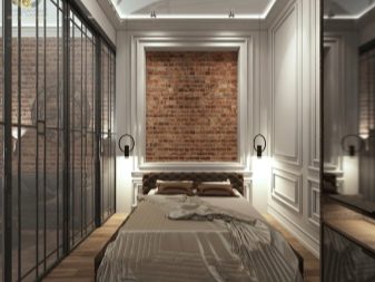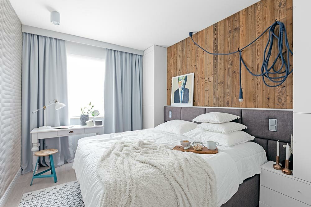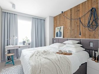La peculiaridad de las habitaciones de estilo escandinavo es que la pared en la cabecera de la cama a menudo se acentúa. Por lo general, está decorado con ladrillos claros o papel tapiz de colores. Además, los espejos grandes encajan perfectamente en el diseño de dicha habitación, expandiendo visualmente el espacio.
