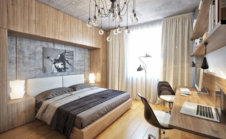 - Dormitorio-estudio. Muy a menudo, el dormitorio también se utiliza como estudio al mismo tiempo. Una mesa con una silla en una habitación de este tipo generalmente se encuentra al lado de la ventana. La oficina se puede separar de la litera mediante estantes altos. Actúan como particiones y se utilizan para almacenar libros y otras cosas pequeñas.