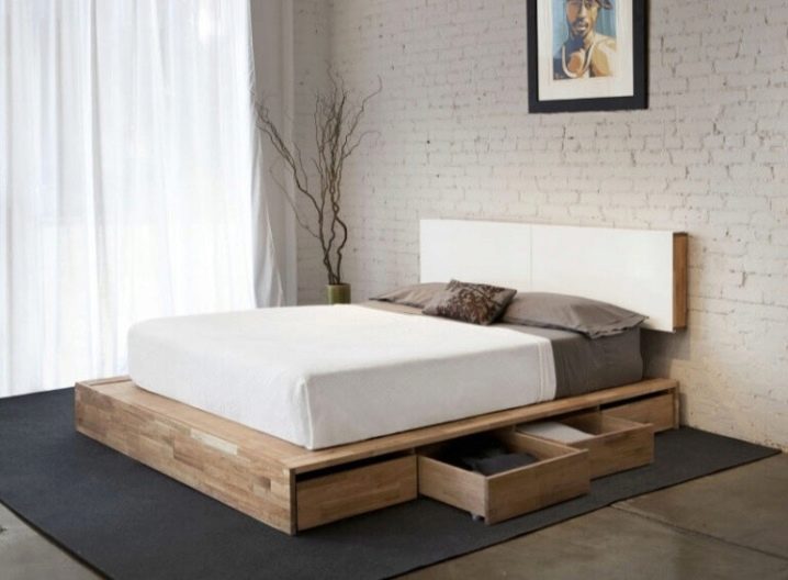 - Mobiliario funcional. Una cama grande sobre un marco de metal o madera con cajones se verá bien en una habitación moderna.