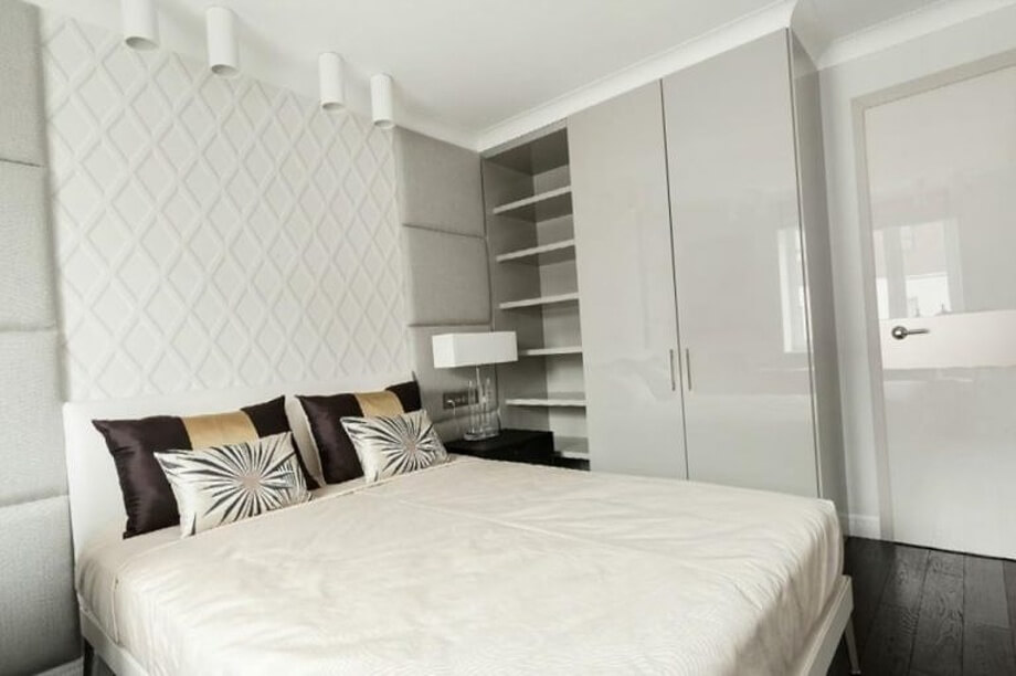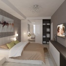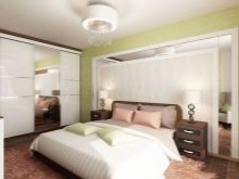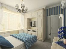 - El segundo elemento importante en el dormitorio es un armario. Para un dormitorio pequeño, un armario sería ideal. Si no hay dónde montarlo, puede poner las cosas en los armarios y la ropa de cama en una cómoda. Una cómoda se coloca junto a la cama, llenando el espacio vacío cerca de la ventana.