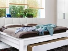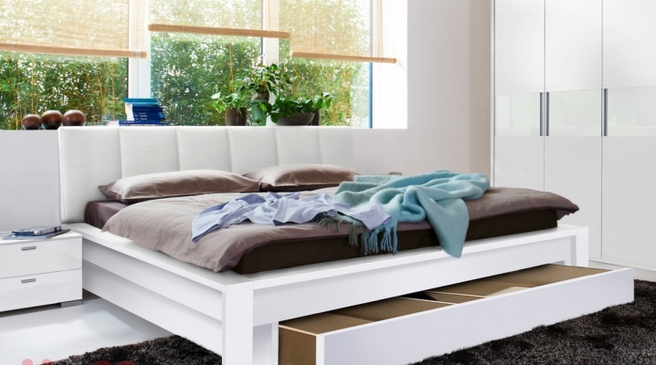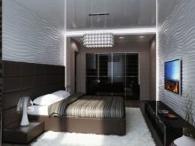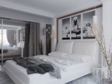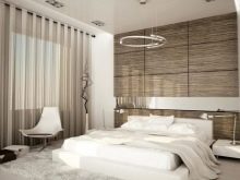 Una cama grande con cajones y mesillas, un armario con espejos, nichos en las paredes te permitirán colocar rápidamente las cosas que necesitas. Se excluyen los productos redondos y suspendidos con un marco pesado. Se prefieren los modelos rectangulares. La cantidad de muebles tapizados se reduce a uno o dos elementos, es mejor comprar sillas ligeras de plástico con una textura suave.