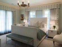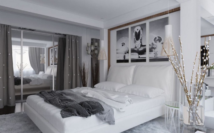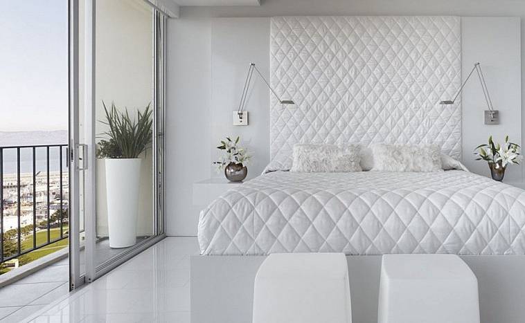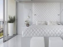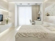 Como muestra la práctica, el diseño del dormitorio en colores claros se prefiere con más frecuencia. Independientemente de los estilos y colores correspondientes que se utilicen en el interior, la gama de luces sigue siendo el líder absoluto. La paleta blanca nunca pierde su relevancia. Esta extensa línea incluye lechoso y blanco nieve, blanco brillante y champán, armoniza con éxito con tonos brillantes y fríos y se utiliza en combinaciones de colores contrastantes. La idea de un aumento visual de volumen se logra de manera óptima.
