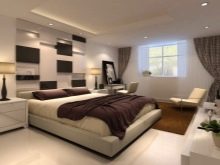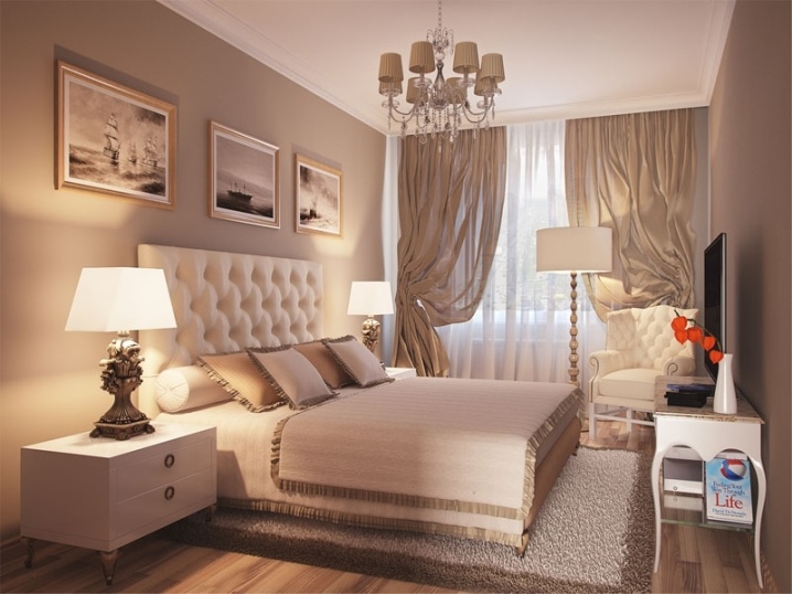Un dormitorio lleno de muebles siempre debe tener una sensación de aire. Por tanto, la ubicación de los objetos es muy importante. Arreglar los elementos y arreglar el interior para que no haya pilas es la tarea principal. La división correcta en zonas depende de cómo se verá el dormitorio, cómo se realizarán las funciones.