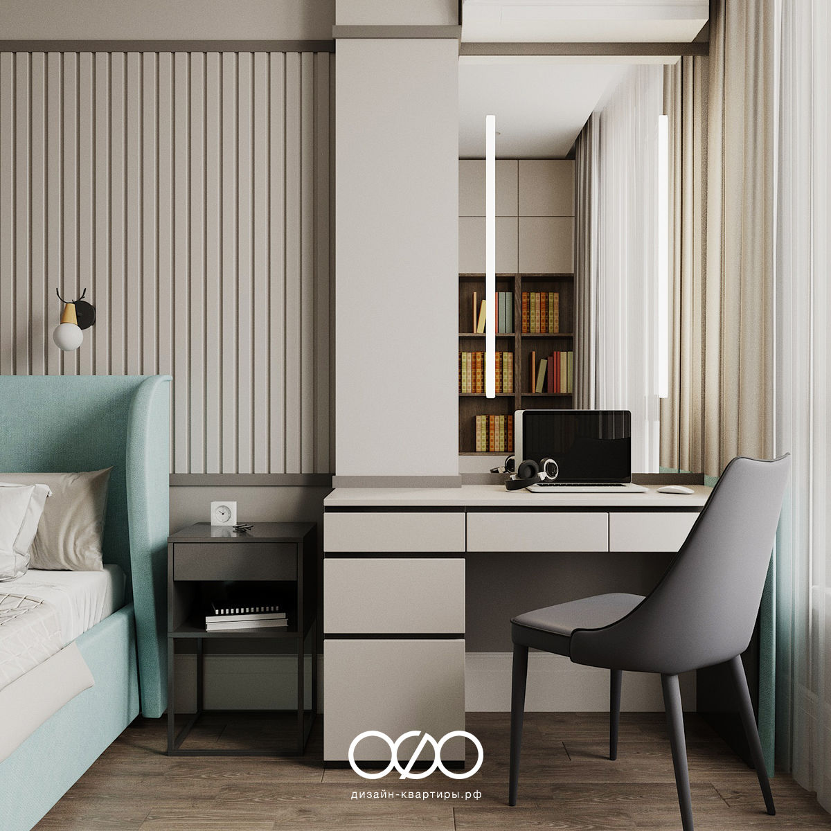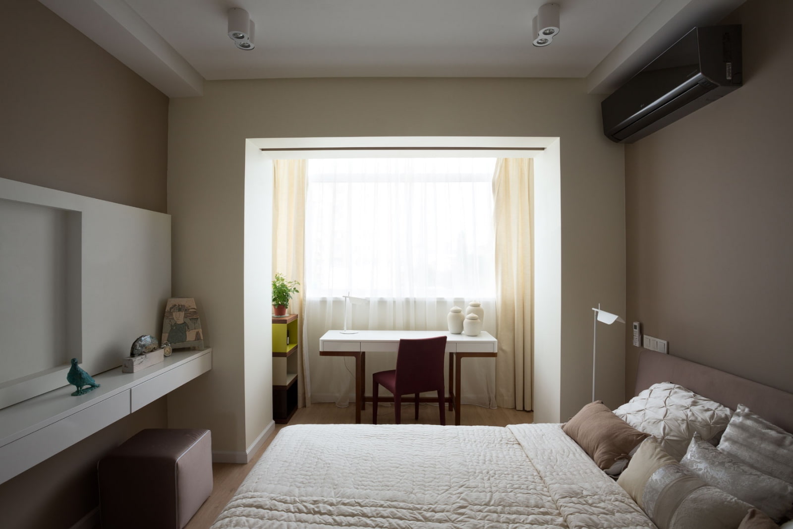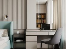 En este caso, el lugar de trabajo se puede organizar en lugar de la mesita de noche. Allí se coloca una mesa para una computadora o computadora portátil, de al menos 60 cm de largo. Si el dormitorio es alargado, la mesa se puede colocar junto a la ventana.
