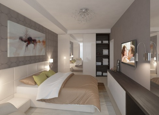- Es conveniente guardar ropa y zapatos en el vestidor. Este es el nombre de un compartimento con puerta batiente en forma de mini-habitación. Un espacio separado le permite doblar las cosas de manera ordenada y tener fácil acceso a ellas. Y aunque no tiene sentido resaltar un vestidor en una habitación pequeña, reduciendo la sala de estar, en un dormitorio estrecho y rectangular es posible.