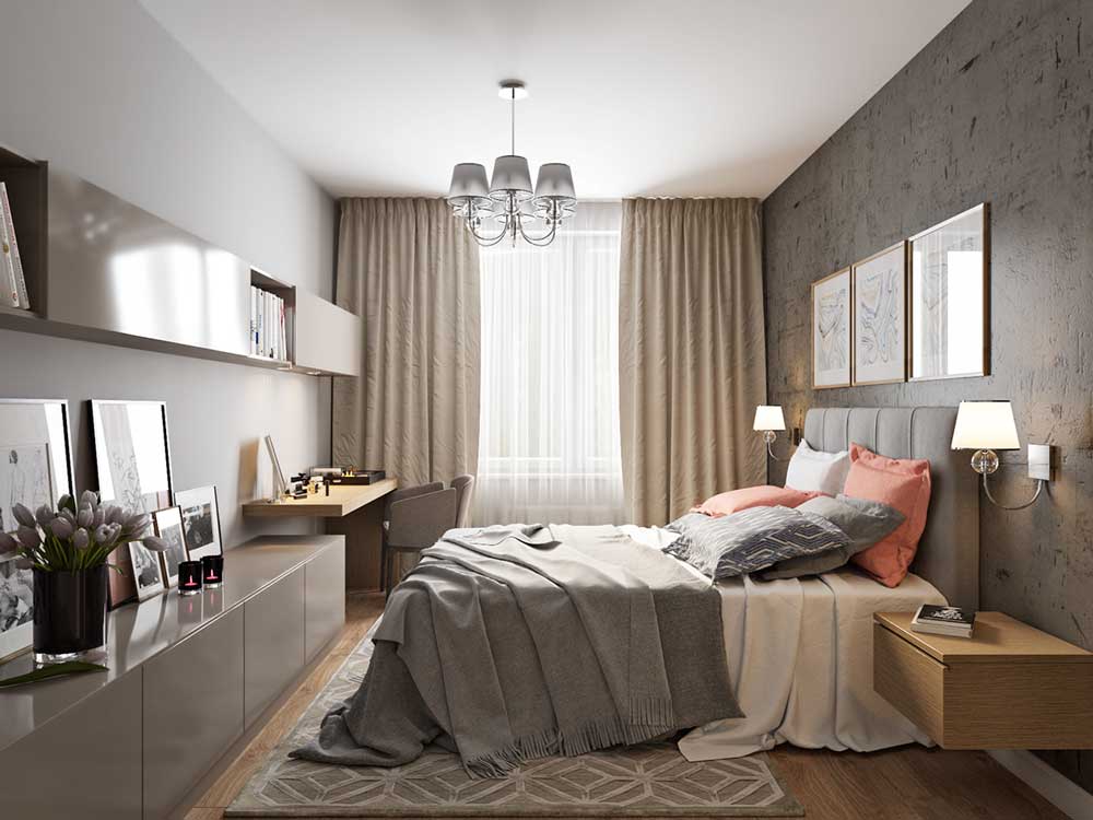 El color gris y sus múltiples tonalidades merecen una mención especial. Los psicólogos han demostrado que son los tonos grises y plateados en el interior los que pueden ayudar a superar el estrés. Por lo tanto, si la habitación se usa solo como dormitorio, los tonos ahumados y grisáceos son más adecuados para la decoración que otros. Eso no excluye su combinación con tonos neutros y cálidos.