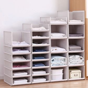 - Modelos clásicos. Dichas estructuras contienen varios niveles de estantes fijados en bastidores, que se encuentran en las esquinas de la estructura o en los lados. Modelo cómodo y sencillo que se puede poner en el vestidor junto al dormitorio.