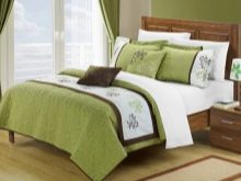 La tercera opción para los amantes modernos parece bastante elegante. La ventaja de este dormitorio son los muebles de madera, que combinan perfectamente con el color oliva y no requieren acabados adicionales.