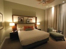 La foto muestra una hermosa habitación minimalista. El color oliva enfatiza perfectamente las ventajas de la habitación, los diseñadores lograron enfatizar la cama, el sillón y las cortinas. También la cabecera está "resaltada" con oliva. El diseño es fresco y bastante ligero.