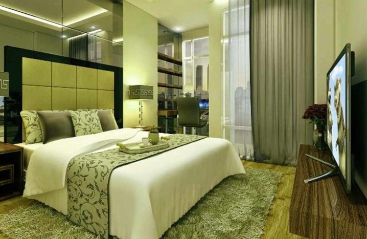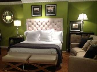 Para organizar un dormitorio en tonos oliva, debe cuidar la disposición correcta de los muebles. Esto ayudará a enfocar la atención de los visitantes a la habitación en las cosas correctas y hará que el interior sea más cómodo.