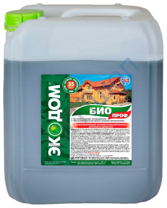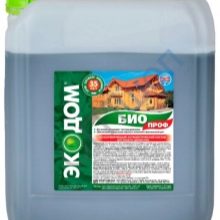 - Antiséptico conservador "Ecodom Bioprof"aplicado con éxito en materiales de madera y estructuras prefabricadas. Se distingue por su protección contra ignición y explosiones, seguridad para las personas. Con aplicación superficial, el efecto dura hasta 5 años. La impregnación profunda está diseñada para 30-35 años de protección contra hongos.