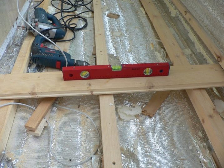 Además, con la ayuda de anclajes, la estructura se fija y se colocan rezagos para su posterior fijación con tornillos. Al final de elevar el nivel con barras, se adjunta tablero de aglomerado, sobre el cual se coloca posteriormente el revestimiento de acabado. Subir el nivel con barras no lleva mucho tiempo. Este método no requiere habilidades y habilidades especiales y ahorrará el presupuesto familiar.